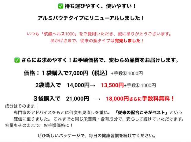 名称:核酸ヘルス1000(世界15カ国特許・核酸栄養食品普及協会推奨製品)