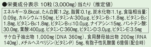 成分:DNAを豊富に含むサケ白子抽出物RNAを豊富に含むビール酵母エキス